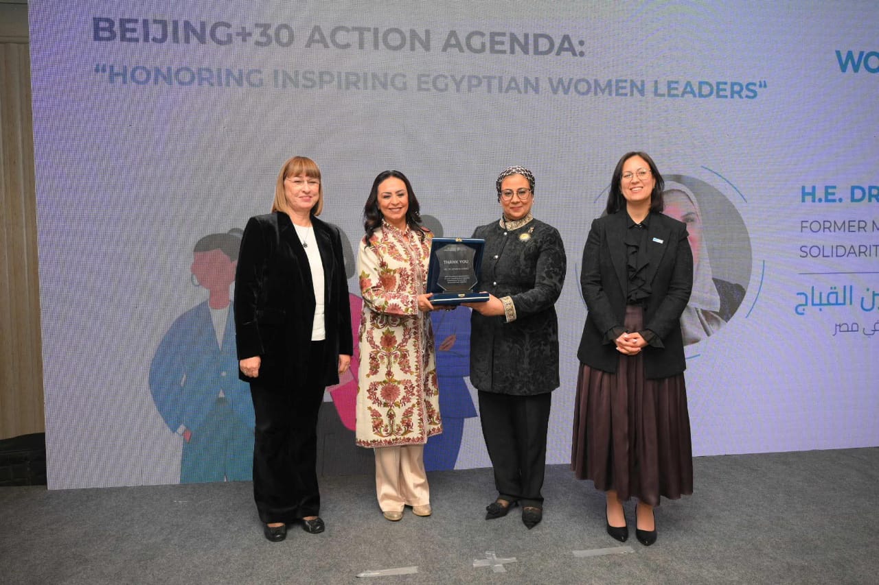 كرمت هيئة الأمم المتحدة للمرأة في مصر الدكتورة نيفين القباج وزيرة التضامن الاجتماعي السابقة تقديراً لمجهوداتها خلال الفترة السابقة، وذلك خلال فعالية ” أجندة بكين +30 .. تكريم القيادات النسائية المصرية الملهمة”، والتي تأتي بالتزامن مع الاحتفال بالذكرى الـ30 للمؤتمر العالمي الرابع للمرأة.